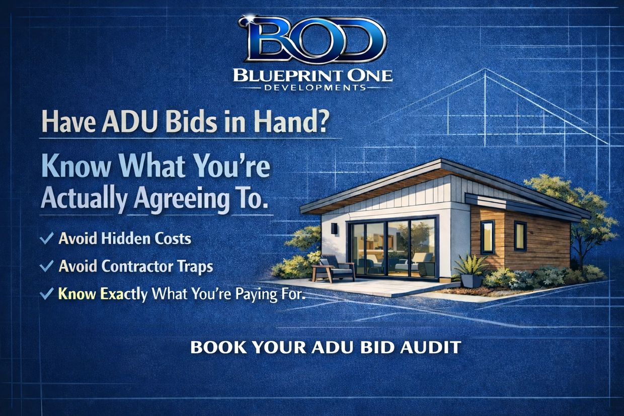 The ADU Review exists to protect homeowners before they commit to a six-figure construction contract. Most bids look similar on the surface, but the real differences are in scope coverage, payment timing, and infrastructure assumptions. This review identifies risk, exposes gaps, and gives you clear direction before you sign.